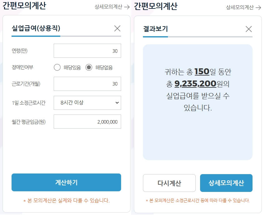 예를 들어 만 30세에 퇴직한 근로자가 30개월 고용보험에 가입되어 있었고 1일 8시간 이상의 월 200만원의 급여를 받았다면 받게 150일 동안의 9,235,200원의 금액을 받을 수 있습니다. 상세 모의 계산을 진행하시면 3개월간의 평균 임금과 월 납부 보험료도 포함하여 더 자세한 금액을 확인할 수 있습니다.