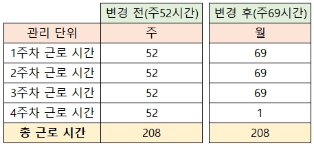 만약 첫 주에 69시간을 근무하게 이미 29시간의 초과근무를 한 것이 되고 '선택권'에서 노사 합의로 1달 총량의 근무 시간으로 관리할 경우 1주차에만 29시간의 초과근무 시간을 사용하여 남은 초과근무 시간이 23시간 (52시간-29시간)이 됩니다. 즉, 주 69시간은 월 1회를 넘을 수 없게 됩니다.