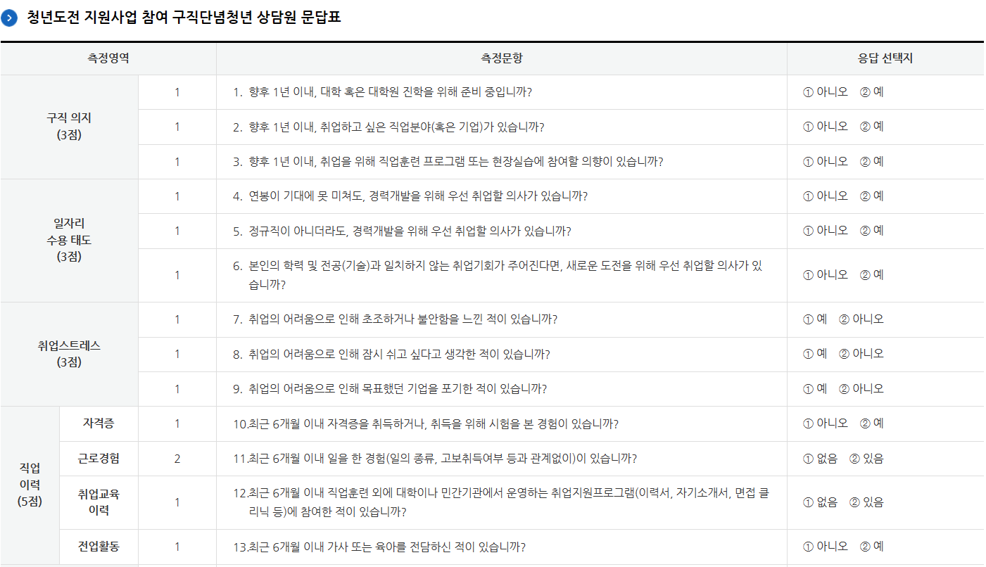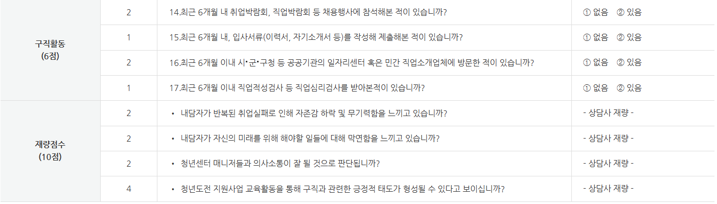 ▷ 취업단념자 : 6개월 이상 취업 및 직업 교육 훈련 참여 이력이 없으며(고등학교 졸업(예정)자는 예외), 구직 단념 청년 문답표 21점 이상인 청년
